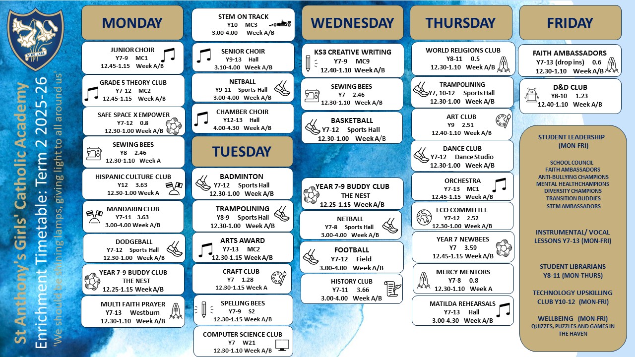 We have a wide and exciting range of enrichment opportunities available during lunchtime and after school for students to participate in. Here are the timetables for this term: PE Department Term 2 2025-26 78 KB Whole School Enrichment Timetable Term 2 2025-25 338 KB